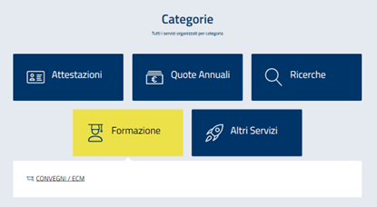 | Cliccare in home page del sito dell’Ordine su “Accedi ai servizi online”, effettuare l’accesso con SPID o CIE, cliccare su FORMAZIONE > CONVEGNI / ECM |