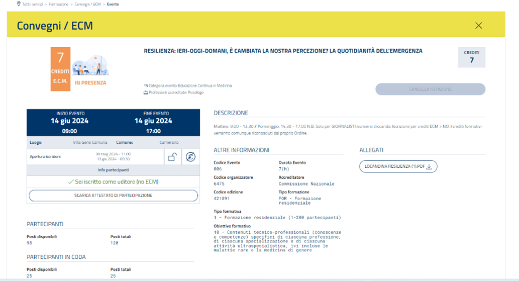 Nel catalogo dei Convegni, cliccare in alto sul filtro “I MIEI EVENTI”, verrà così visualizzato solo l’elenco degli eventi a cui risultate iscritti.